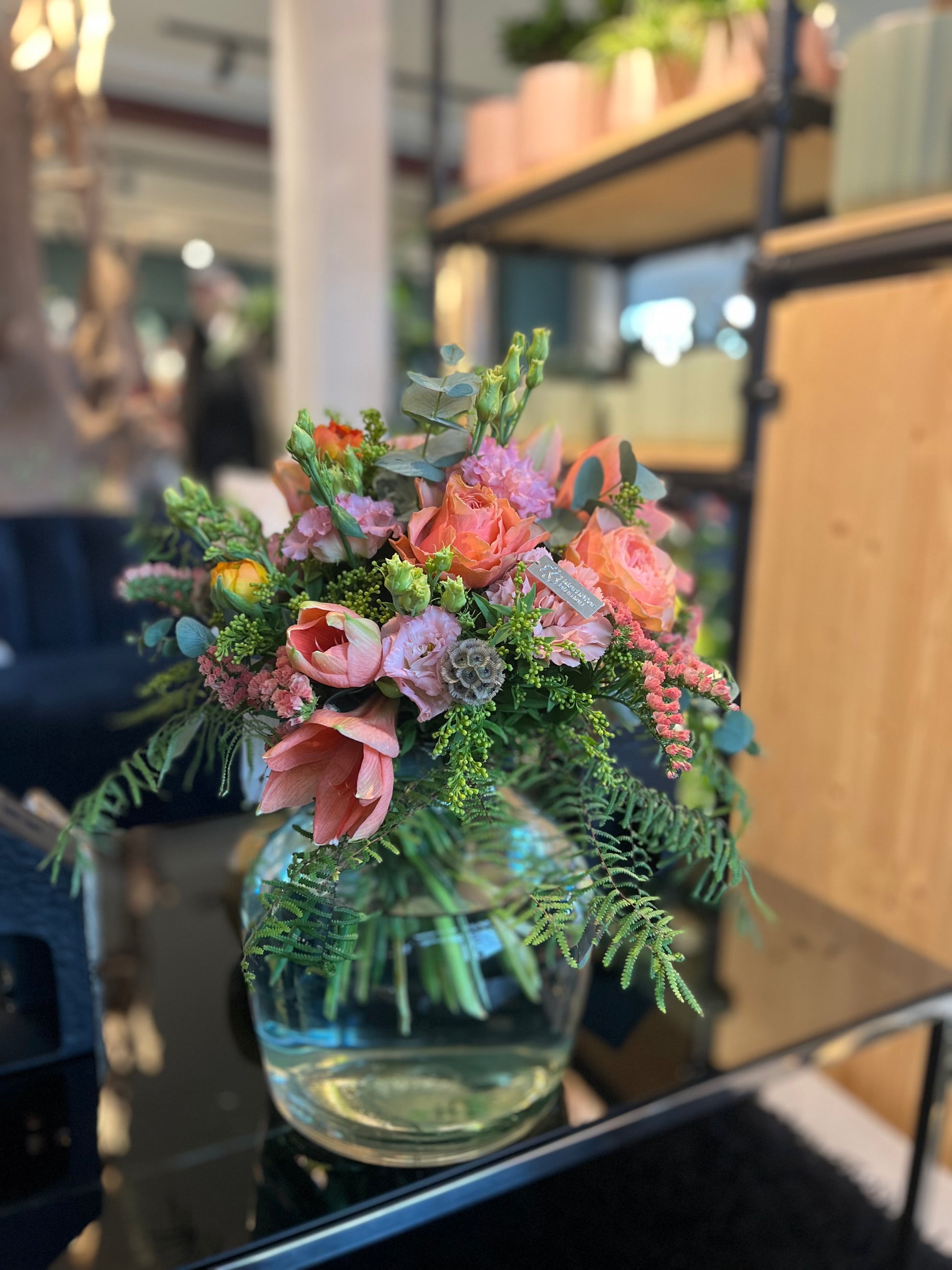 Die im Strauß verarbeiteten Blüten variieren je nach Angebot im Laden und Jahreszeit.