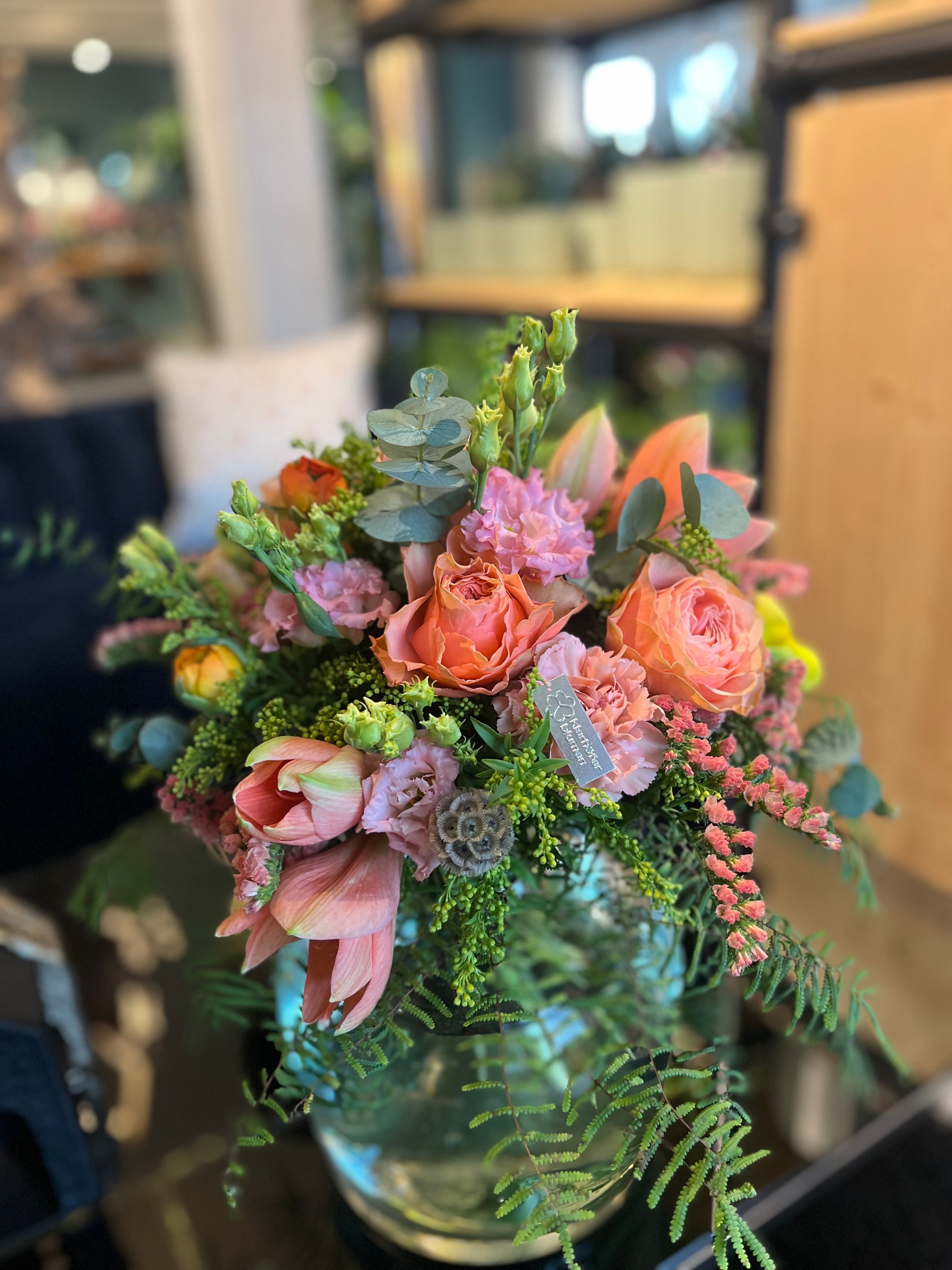 Ein aufgelockerter Strauß mit apricot-farbenen Blüten.