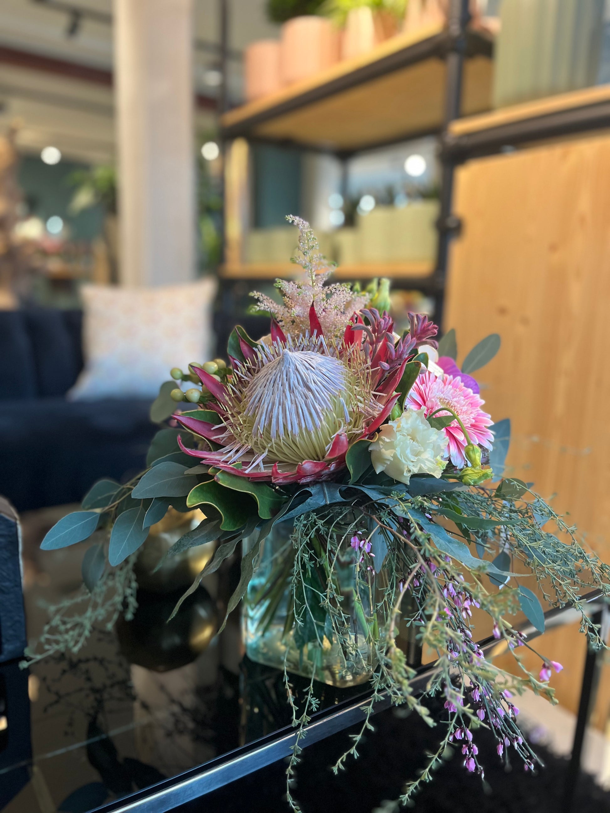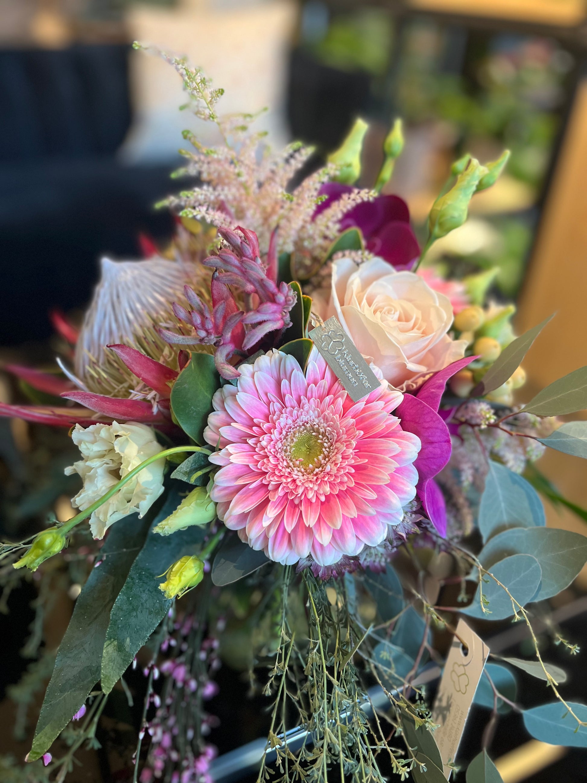 Ein kompakter Strauß mit rosa und pinkfarbenen Exoten kombiniert mit verschiedenen Blüten. Die im Strauß verarbeiteten Blüten variieren je nach Angebot im Laden und Jahreszeit.