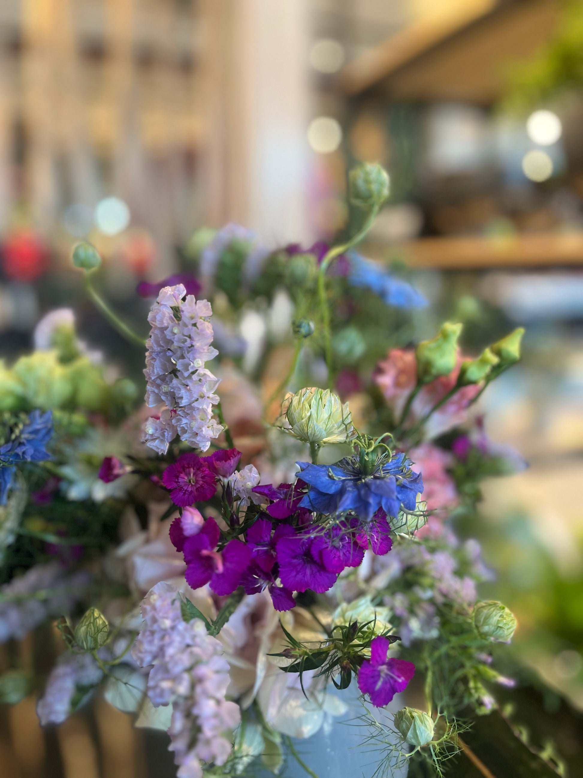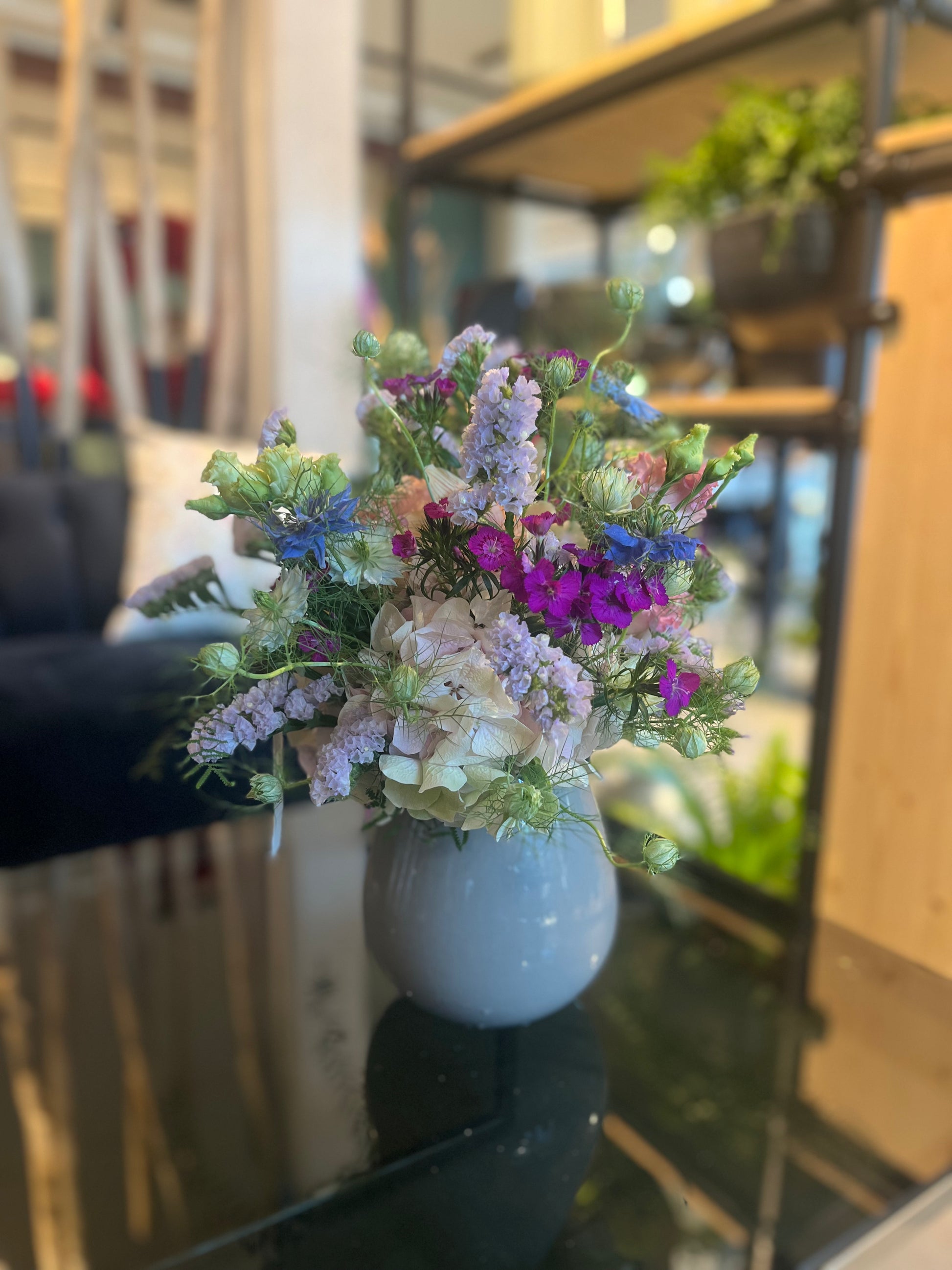 Die im Strauß verarbeiteten Blüten variieren je nach Angebot im Laden und Jahreszeit.
