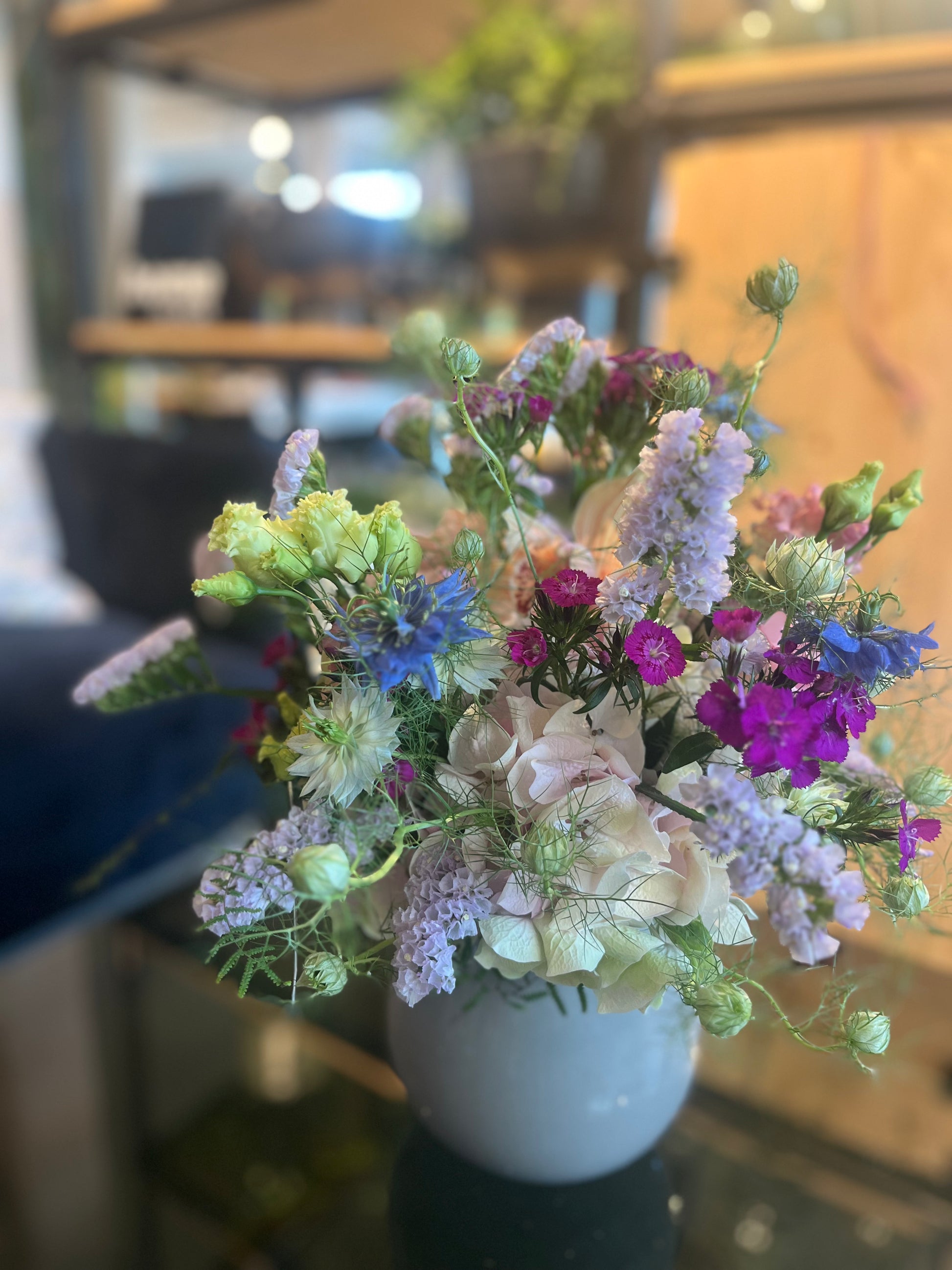 Ein fluffig, wiesig gebundener Strauß mit pastellfarbenen bunten Blüten. Auf dem Bild ist die Größe "medium" abbgebildet.